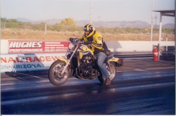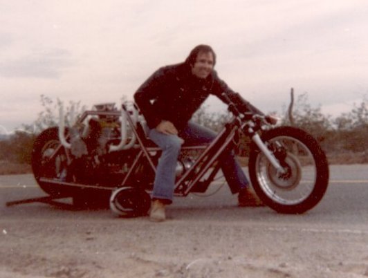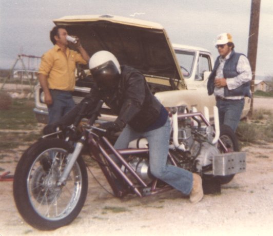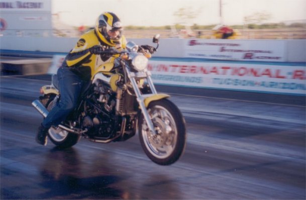 Back in 83' I hooked up with a guy that liked to build and race V-8 powered drag bikes. Since he almost lost a leg when the chain came off his cobra powered bike, he was looking for someone to pilot his latest insane creation and it sounded like fun to me. We did some exibition runs at the Nationals in Las Vegas with this aluminum small block V-8. Ran 160 in the mid 9's, but with only one gear we basically burned half way down the strip and keeping the front end in front of the rear end was the trick. |