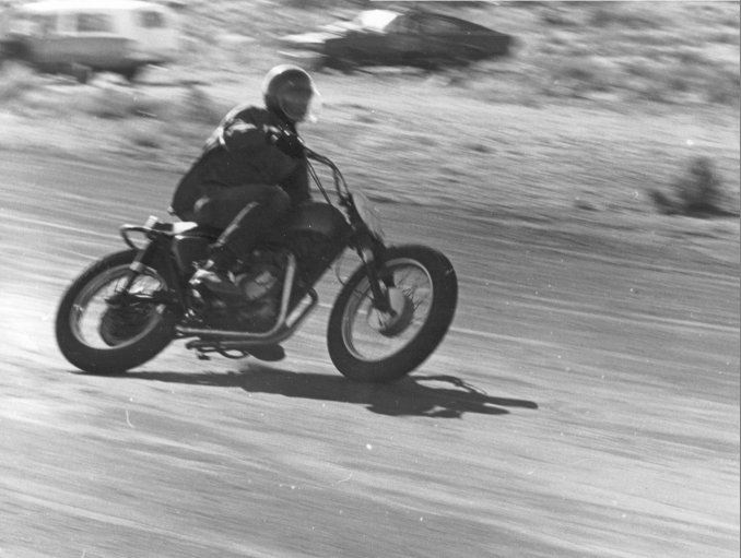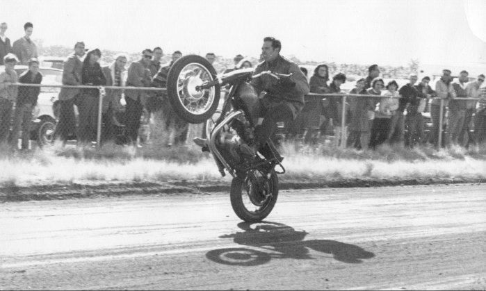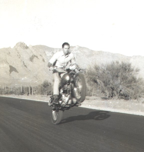 Doing a little wheelie back in 1965 on a Triumph Bonneville I borrowed from a buddy of mine in the Navy. We were both a little crazy so I'm sure he didn't mind me hot dogging some. |